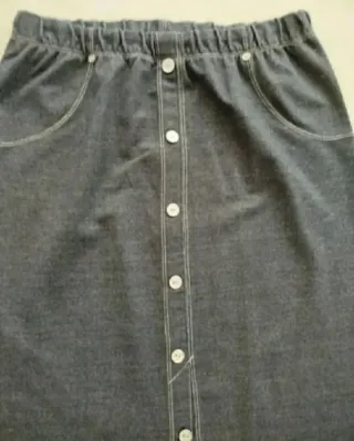 Falda de corte recto con goma elástica en la cintura para mayor comodidad. - Cierre de botones en la parte delantera. - Bolsillos laterales simulados - Costuras blancas decorativas.