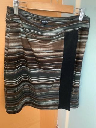 Falda con estampado de rayas horizontales en tonos marrones y multicolor. Presenta un panel lateral de color negro. - Diseño con cintura elástica. - Corte moderno.