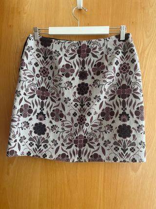 Falda corta con un bonito estampado floral. - Diseño con flores en tonos morados y beige. - Tejido texturizado.