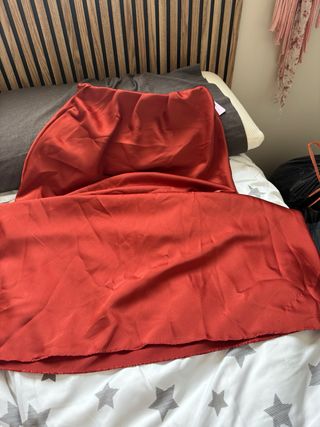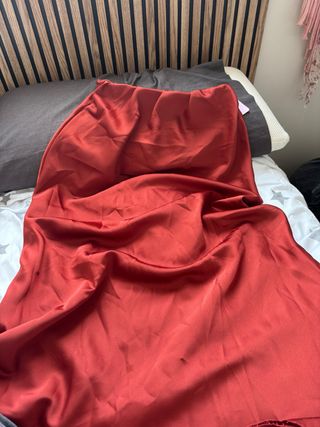 Falda larga de satén con un bonito color rojo. Su tejido es ligero y con una caída muy elegante. - Tejido satinado. - Diseño largo.