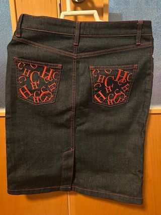 Falda vaquera de la marca Carolina Herrera. - Costuras en contraste rojo. - Diseño de corte recto. - Bolsillos delanteros.