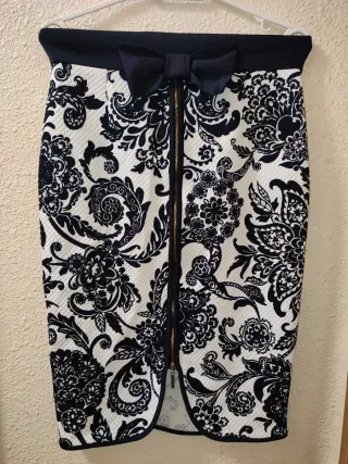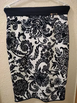 Elegante falda con un llamativo estampado floral en blanco y negro. - Tejido texturizado con patrón acolchado. - Cintura alta. - Detalle de etiqueta dorada en la cintura. - Precioso lazo negro en la parte trasera. Talla L #FaldaElegante #FaldaFloral #FaldaBlancoNegro #ModaMujer #RopaMujer #EstiloChic #TallaL #FaldaDeDiseño #CinturaAlta #LazoNegro #DetalleDorado #LookFemenino #OutfitChic #RopaDeCalidad