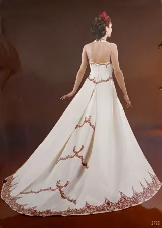 Vestido de novia, talla 40, en raso color marfil y cola larga. Una pieza. Detalles de encaje en color granate. Escote al cuello. Predio original 1500€, rebajado por liquidación. - Diseño de corte imperio. - Escote halter. - Bordados decorativos en el corpiño y la falda. - Cola larga.