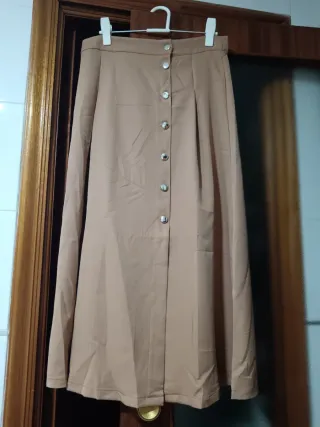 Falda larga de color beige con botones frontales. - Diseño elegante y versátil. - Cierre de botones plateados. - Corte amplio y fluido.