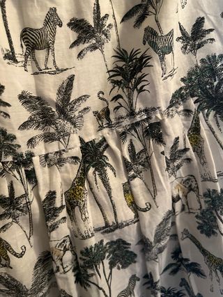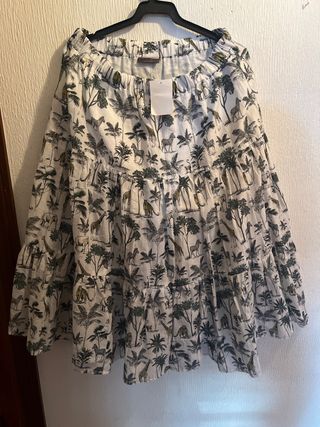 Falda larga con un divertido estampado de animales y palmeras. - Diseño con volantes. - Cintura elástica. - Estampado de safari.