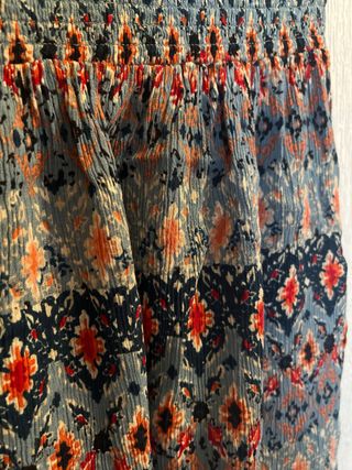 Falda larga con un bonito estampado étnico en tonos verdes y negros. Tiene un vuelo ligero que la hace muy cómoda. - Diseño con motivos florales y geométricos. - Detalle de pequeñas cuentas o pedrería.