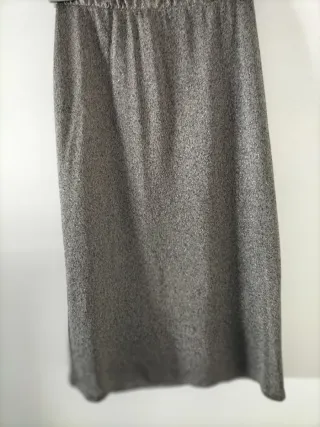 Falda recta de punto con un diseño elegante y discreto. Su tejido gris plateado con discretos brillos le da un toque especial. - Corte recto. Cintura elástica adaptable. Abertura baja posterior. Talla 42. Largo 66 cm.