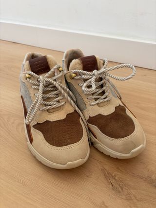 Zapatillas de mujer de la marca Gant en talla 39. Combinan tonos beige y marrón con detalles de ante y tejido. - Diseño deportivo y casual. - Forro interior suave. - Cordones a tono. usadas 2 veces