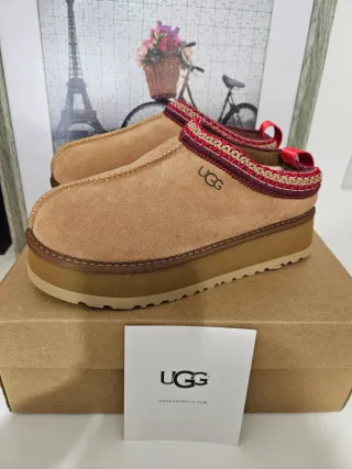Botas UGG modelo Tazz. - Diseño tipo mule. - Detalle de borde tejido en rojo y burdeos. - Tirador trasero en rojo. - Plataforma gruesa.