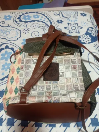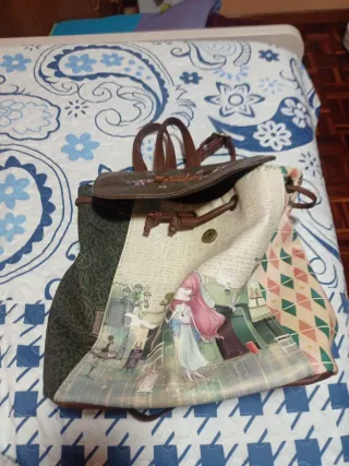 Mochila con un diseño único y llamativo, combinando diferentes estampados. - Estampado principal con escena de anime y detalles de texto. - Panel lateral con estampado de encaje verde. - Panel lateral con diseño geométrico de rombos. - Asas y detalles en cuero sintético marrón.