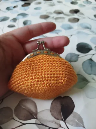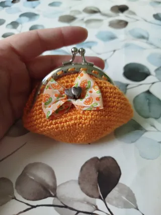 Pequeño monedero de crochet con un bonito lazo decorativo. - Hecho a mano con hilo. - Cierre de metal. - Adornado con un lazo de tela con estampado floral.