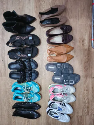 Lote de zapatos en buen estado, talla 37/38. - Zapatos planos rosas. - Zapatos plateados. - Sandalias amarillas. - Botines rosas y marrones. - Zapatos de tela a rayas. - Zapatos fucsia. - Zapatos azules. - Mocasines marrones. - Zapatos planos azules con lazo. - Zapatos de tacón negros.