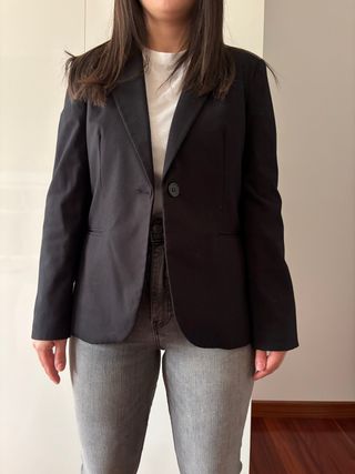 Conjunto de chaqueta y pantalón de vestir. - Chaqueta con solapa. - Cierre de botón en la chaqueta. - Pantalón de vestir a juego. - Es una M pequeña. - Al pantalon se le cogió al largo. Longitud desde entrepierna 75 cm. - Usado dos veces, muy buen estado.