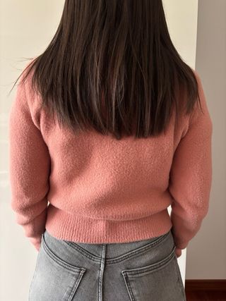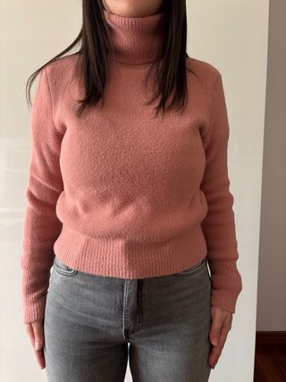 Jersey con cuello alto en un bonito tono rosa. La textura es suave. Muy poco uso. En perfecto estado.