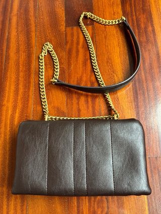 Elegante bolso marrón con un diseño acolchado y detalles en cadena dorada.