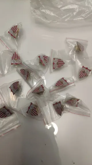 Conjunto de pines con el escudo del Sevilla FC. Perfectos para coleccionistas o aficionados. - Diseño del escudo del Sevilla FC. - Acabado en dorado y rojo.