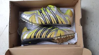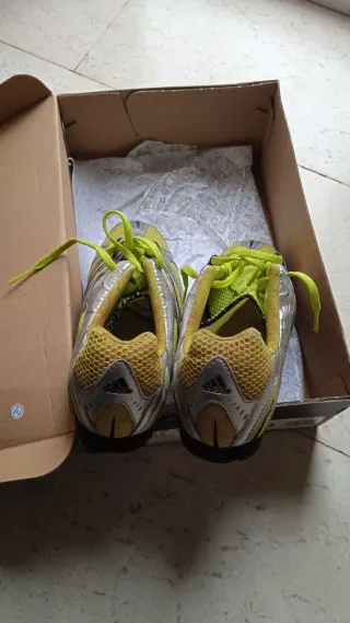 Zapatillas de atletismo Adidas con clavos cortos.Me quedan pequeñas las vendo antes que me haga daño en los pies.Es para fondo de pista o campo a través. - Color plata y amarillo. - Diseño deportivo.