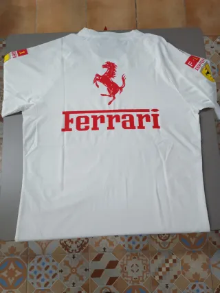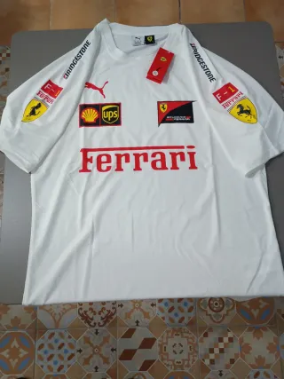 Camiseta de la escudería Ferrari de Fórmula 1. - Diseño blanco con logos de Ferrari, Puma, Bridgestone, Shell y UPS. - Estampado F-1 Ferrari en las mangas. - Logo de Scuderia Ferrari en el pecho.