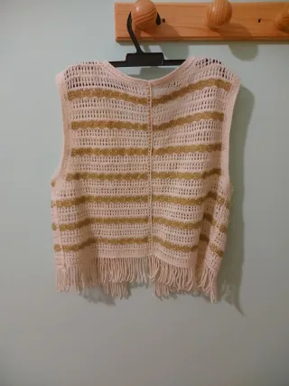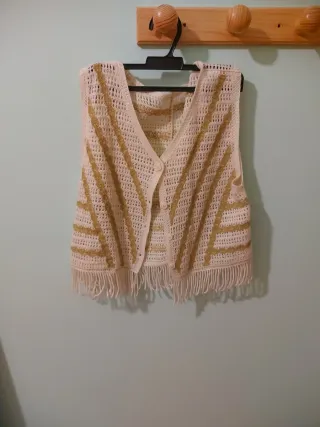 Chaleco de crochet con un diseño de rayas en tonos beige y dorado. Presenta un acabado con flecos en la parte inferior. - Diseño de rayas diagonales. - Cierre de botones. - Flecos decorativos en el bajo.