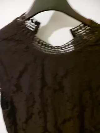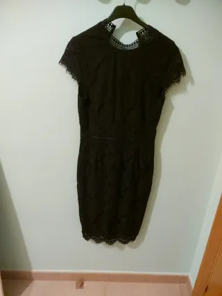 Elegante vestido de encaje con un diseño entallado. - Escote de cuello alto con detalle de encaje. - Mangas cortas con borde festoneado. - Cintura con detalle de encaje. - Bajo con borde festoneado.