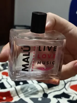 Frasco de perfume de la marca Malú con el diseño Live Love Music. - Diseño transparente. - Tapa negra. - Líquido rosado en su interior.