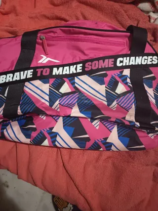 Bolso de gimnasio con un diseño llamativo y moderno. - Estampado geométrico en tonos rosas, azules y negros. - Cinta negra con la frase BRAVE TO MAKE SOME CHANCES.