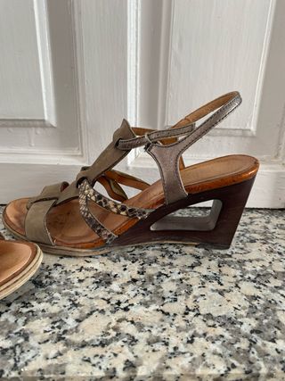 Elegantes zapatos de cuña con un diseño moderno. - Combinación de materiales en tonos marrones y bronce - Correa ajustable en el tobillo. - Cuña de madera oscura.