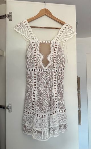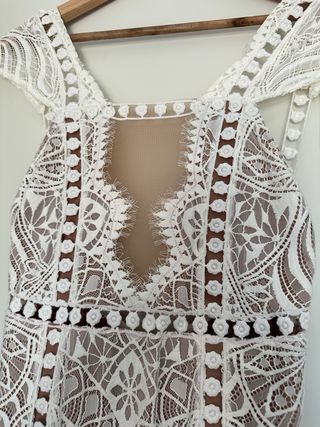 Vestido corto de la tienda Fetiche Suances, de la firma For love & Lemons, en color blanco, con transparencias y bordados. Es espectacular y luce muchisimo. Nuevo