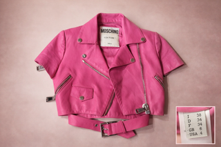 Chaqueta corta de cuero rosa de Moschino Couture. - Diseño tipo biker. - Cremalleras plateadas. - Botones a presión plateados.