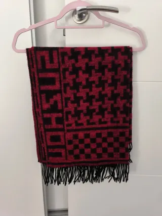 Bufanda de lana con un llamativo diseño geométrico en rojo y negro. Perfecta para añadir un toque de estilo a cualquier atuendo. - Tejido de lana suave. - Diseño de rombos y cuadros. - Flecos en el borde inferior. 5€ la unidad.