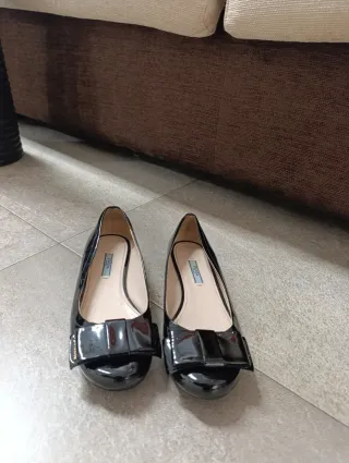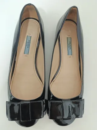 Bailarinas PRADA, fabricadas en Italia. Modelo clásico en charol negro con lazo frontal y logo PRADA discreto. ✔️ Muy cómodas ✔️ Elegantes y atemporales ✔️ Ideales para uso diario o looks formales Estado: muy bueno, signos normales de uso (ver fotos reales). Material: charol Color: negro Talla: 38 Precio en tienda muy superior. Se venden por limpieza de armario.