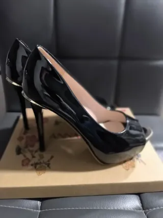 Elegantes zapatos de tacón con acabado brillante. - Diseño peep-toe. - Plataforma delantera. - Tacón de aguja alto. - Detalle metálico en el borde. - altura del tacón 11'5 cm
