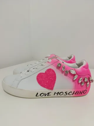 Zapatillas Love Moschino originales, nuevas, sin uso. Color blanco con detalles en rosa, corazón decorativo y aplicaciones brillantes. Diseño muy llamativo y original. • Nuevas, nunca usadas • Talla EU 38 • Muy cómodas • Estado impecable Se venden por limpieza de armario. Precio en tienda muy superior. Envío seguro por Wallapop.