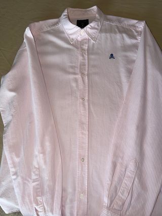 Camisa de Scalpers con un diseño de rayas finas en tono rosa. Presenta un pequeño detalle bordado en el pecho. - Cuello abotonado. - Puños con botón. - Raya fina vertical.
