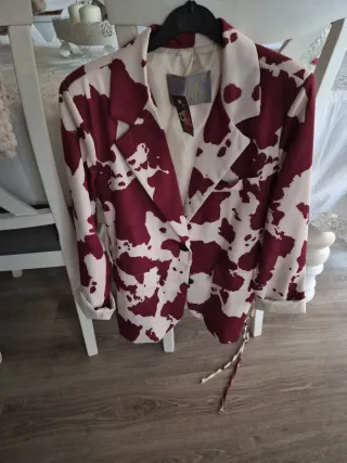 Elegante chaqueta de raso con un llamativo estampado. - Diseño de manchas en contraste. - Cierre de 2 botones - Solapas clásicas.