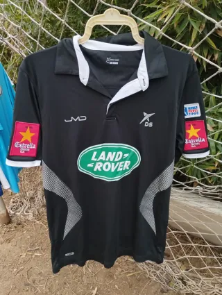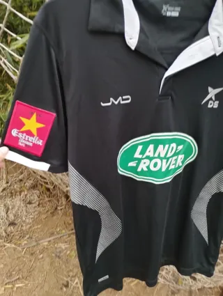 Camiseta de pádel negra con detalles blancos, ideal para entrenamientos o partidos. Dropshot - Patrocinador principal: land Rover - Juan Martín Díaz, con su nombre en la espalda, campeón del mundo - Año 2014 aproximadamente - Con el parche de World pádel tour en la manga - Talla L - Logo de JMD en el pecho. - Parche de Estrella Damm en la manga. - Diseño con líneas plateadas en los laterales. En muy buen estado