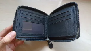 Cartera billetera de cuero sintético con cierre de cremallera. 6 bolsillos para tarjetas (2 de ellas se pueden ver a través del plástico transparente). Bolsillo para monedas y bolsillo para billetes. Cremallera completa para un cierre total. Medidas: 11,5 cm x 9,5 cm