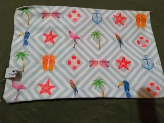 Neceser con un divertido estampado veraniego de la marca Nes Capp. - Diseño con palmeras, flamencos, estrellas de mar, gafas de sol, chanclas, loros, tucanes y anclas. - Fondo con rombos en tonos azules y blancos.
