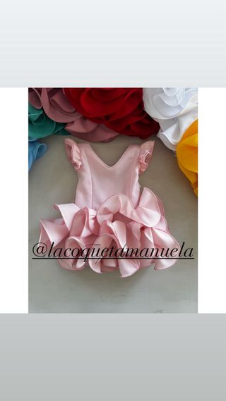 Vestido de flamenca para niña, ideal para ferias. TALLAS 0,1,2,4,6. Diseño con liso . - Volantes en falda y mangas.