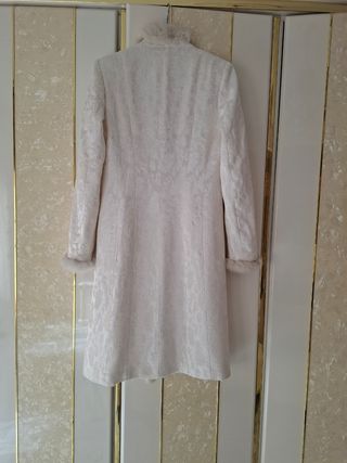 Elegante abrigo de ceremonia en tela Jacquard en color blanco roto. Con ribete en pelo. Forrado interior. Esta entre talla 36 y 38. Una puesta y llevado a la tintorería. Medidas en las fotos.