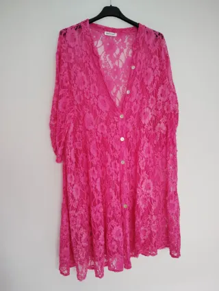 Pijama cómodo y con un diseño delicado. - Manga larga abullonada. - Cuello redondo con detalle de encaje blanco. - Puños y bajo de las mangas con encaje y lazada. - Tejido ligero y arrugado.