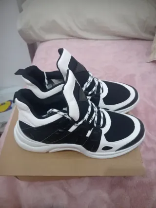 Zapatillas deportivas de caña alta con un diseño moderno y llamativo. - Combinación de colores negro y blanco. - Cordones a contraste. - Detalle triangular en la parte trasera.