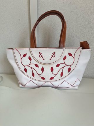 Bolso de mano con un diseño floral bordado en tonos rojos y blancos. - Asas de cuero. - Detalle de bordado en la parte frontal. - Cierre de solapa.