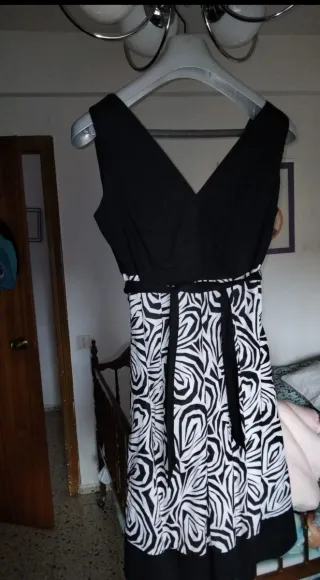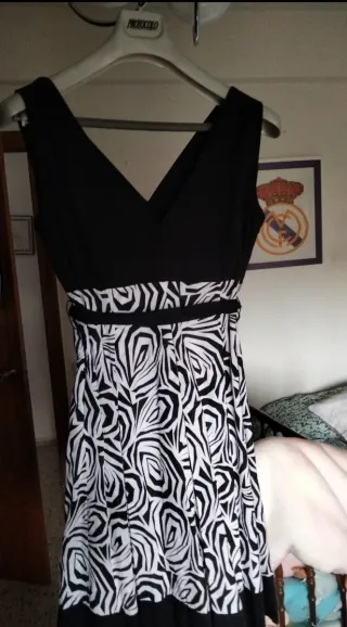 Vestido con un diseño llamativo y elegante. - Parte superior lisa en negro. - Falda con estampado de cebra en blanco y negro. - Cinturón negro a juego. Esta en navalcarnero