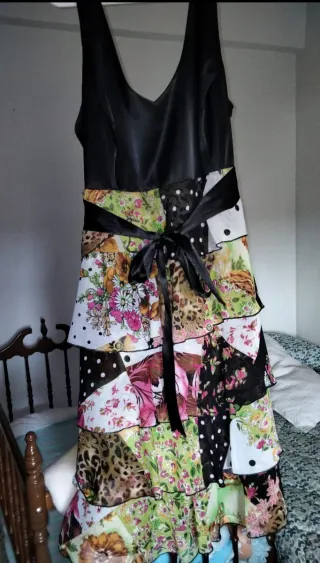 Vestido con un diseño único y llamativo, perfecto para destacar. - Cuerpo superior negro. - Falda con volantes y patchwork de estampados. - Detalle de lazo negro en la cintura. Esta navalcarnero