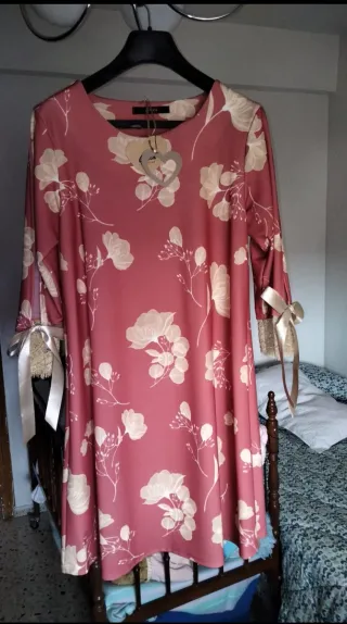 Vestido con estampado floral en tonos rosas y beige. Presenta mangas tres cuartos con detalle de lazo. - Diseño con flores y ramas. - Mangas con lazos y encaje. Esta en navalcarnero
