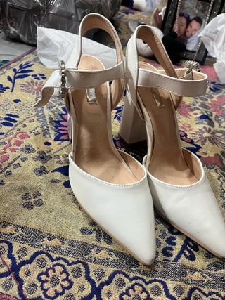 Elegantes zapatos de tacón blancos con un diseño de punta fina y tira al tobillo. Perfectos para ocasiones especiales. - Tira ajustable con hebilla y detalle de pedrería. - Tacón grueso y alto. - Acabado brillante.