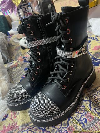 Botas de estilo militar con detalles brillantes. - Diseño de caña alta. - Cierre de cordones. - Tira decorativa con hebilla y pedrería. - Puntera y ribete de la suela adornados con pedrería.