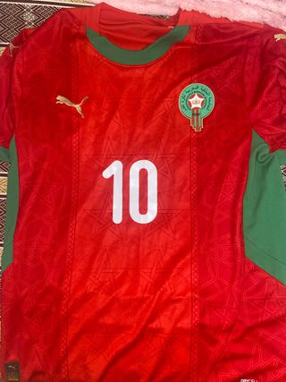 Camiseta de la selección de Marruecos con el número 10, firmada por Brahim. - Diseño con patrón geométrico. - Escudo de la federación marroquí. - Logo de Puma bordado.