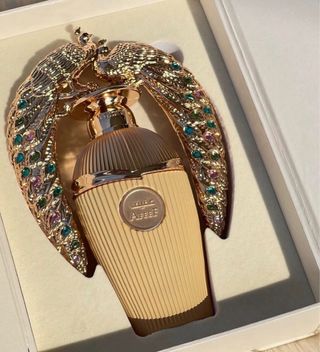 Elegante perfume Lattafa Aféef con un diseño distintivo. - Frasco en tono dorado con detalles acanalados. - Adorno superior con dos pavos reales dorados. - Detalles de piedras multicolores en las alas de los pavos reales. - Etiqueta frontal con el nombre 'Aféef'.